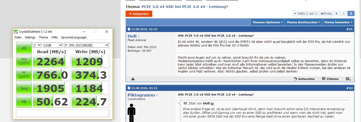 Es ist nicht 4k, sondern 4k QD32 und die SM951 ist eben nicht quasi baugleich mit der 950 Pro, sie hat nämlich nur planare NANDs und die 950 Pro hat 3D V-NAND.