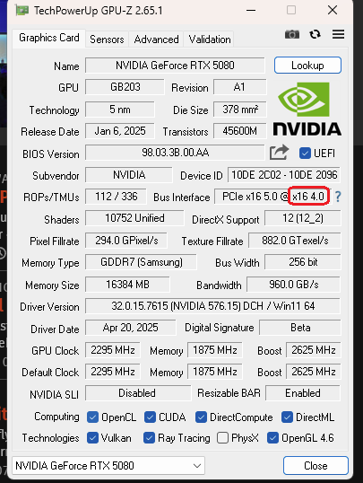 Hallo. Ich habe gerade meine RTX 5080 eingebau tund bereits bei Steel Nomad ind eden Stock Settings Fehler und Abtürze. RTX 4080 wieder re3in. Läuft. Ich wollte gerne PCIE 4.0 testen, da ich ein Riser Kabel 4.0 benutze aber mir trotz Umstellung im BIOS 5.0 anzeigt. Vielleicht habe ich auch etwas falsches eingestellt. Es hieß DMI Speed unjd dann von Auto auf Gen 4 für den ersten Slot. Jemand eine Idee warum GPUZ 5 anzeigt ? Vielleicht wie gesagt auch die falksche Einstellung im BIOS benutzt.