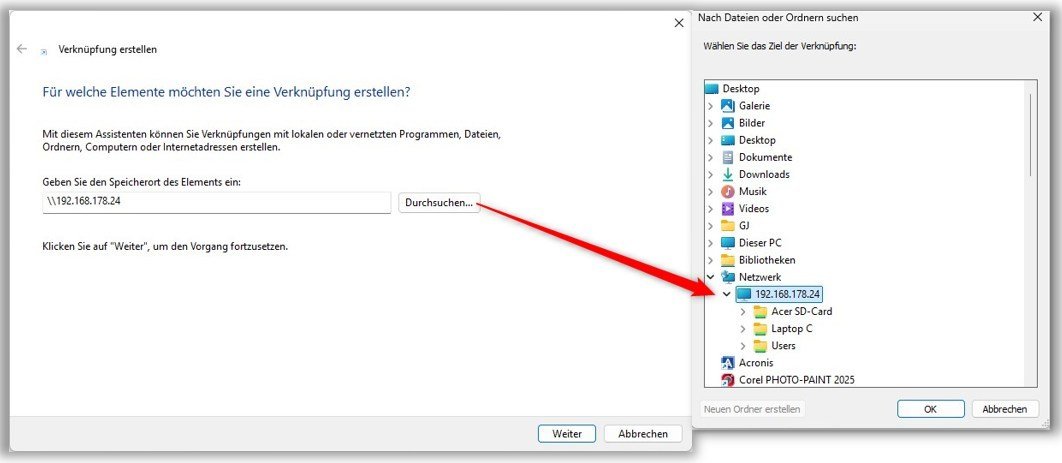 Versuche gerade, unsere PC’s mit WLAN-Netzwerk zu verbinden. Bei meinem neuen PC (PCGJ) hat das geklappt, sowohl den Laptop als auch den PC meiner Frau (PCEJ) konnte ich problemlos erreichen. Ich lege eine neue Verknüpfung an, gebe die ip-Adresse ein und klicke auf Durchsuchen…