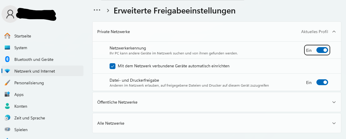 Bei meinem PC ist (wegen Neuinstallation) die Windows 11 Pro 25H2 Build 26200.8039 installiert, Laptop und 2. PC Windows 11 Pro 24H2 Build 26100.8117. Auf allen Rechnern ist privates Netzwerk eingestellt und alle in der Arbeitsgruppe "WORKGROUP". Ich nutze die Fritzbox 7530 AX.