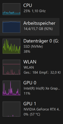Bei mir laufen oft einige Anwendungen parallel (zB einige Excel Sheets, 1-2 Powerpoints, Signal + Whatsapp, QCAD, Outlook), was manchmal schon ausreicht, aber vor allem bei Video-Calls (zB. Google Meet oder Teams) und insbesondere beim Teilen meines Bildschirms wird es dann zu viel. Der Laptop wird dabei teilweise unbenutzbar langsam, so dass das Öffnen einer Excel Datei bis zu einer Minute braucht, der Mauszeiger lagt, oder die Navigation in Powerpoint zur Qual wird, natürlich ist auch die Performance in der Kommunikationssoftware entsprechend eingeschränkt.