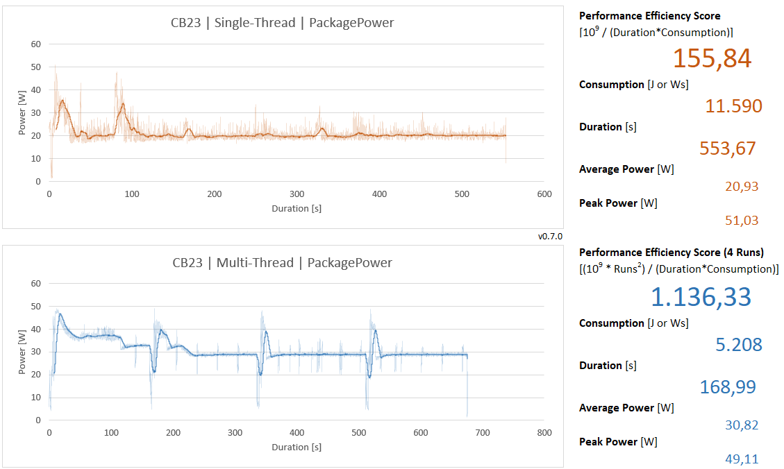 Anbei meine Ergebnisse von einem Dell 7506 mit i7-1165G7 im Modus Ultra-Leistung. Ich habe einmal mit Turbo gemessen und einmal ohne. Bei der Messung ohne Turbo läuft die CPU im Basistakt stabil mit 2,8 Ghz. Das ist viel effizienter wie man sehen kann, der aggressive Turbo drückt die Effizienz doch ziemlich nach unten. Die letzten paar hundert Mhz werden teuer erkauft.