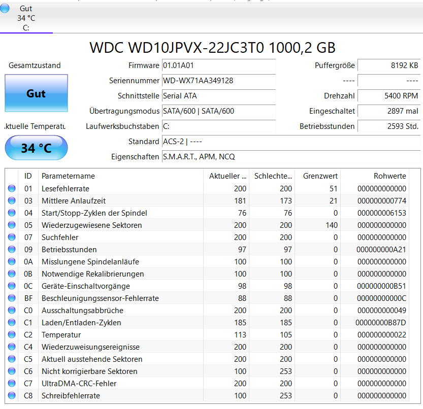 Die sieht soweit ok aus. Die Verlangsamung hängt also nicht mit einer defekten HDD zusammen. Das einzige Auffällige sind die 12 Beschleunigsungssensor-Ereignisse, aber das wird nach dem Einbau einer SSD ebenfalls hinfällig bzw. nicht mehr von Belang sein.