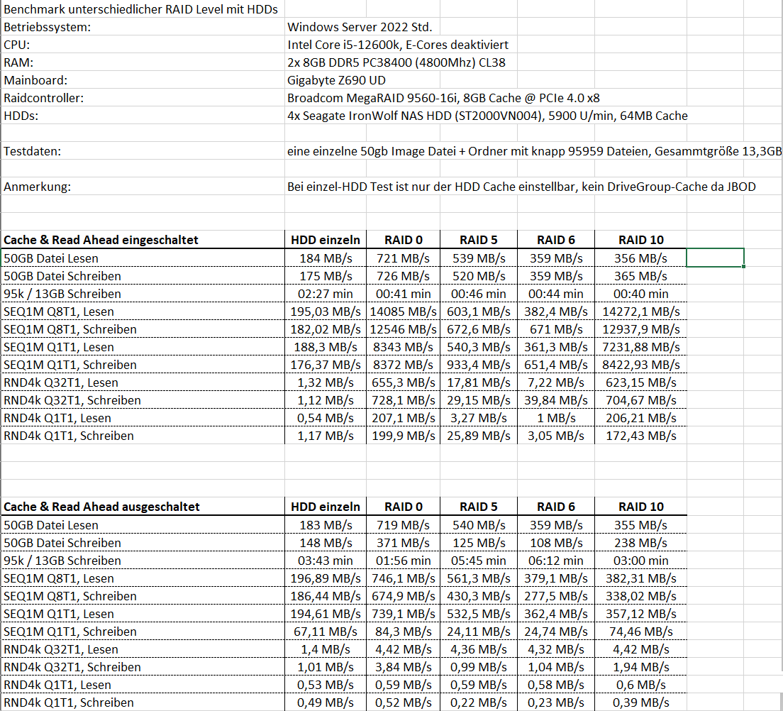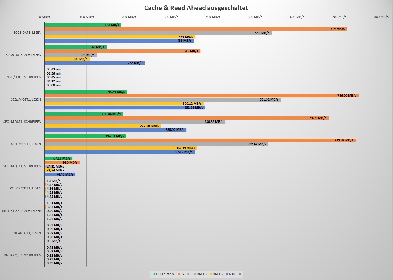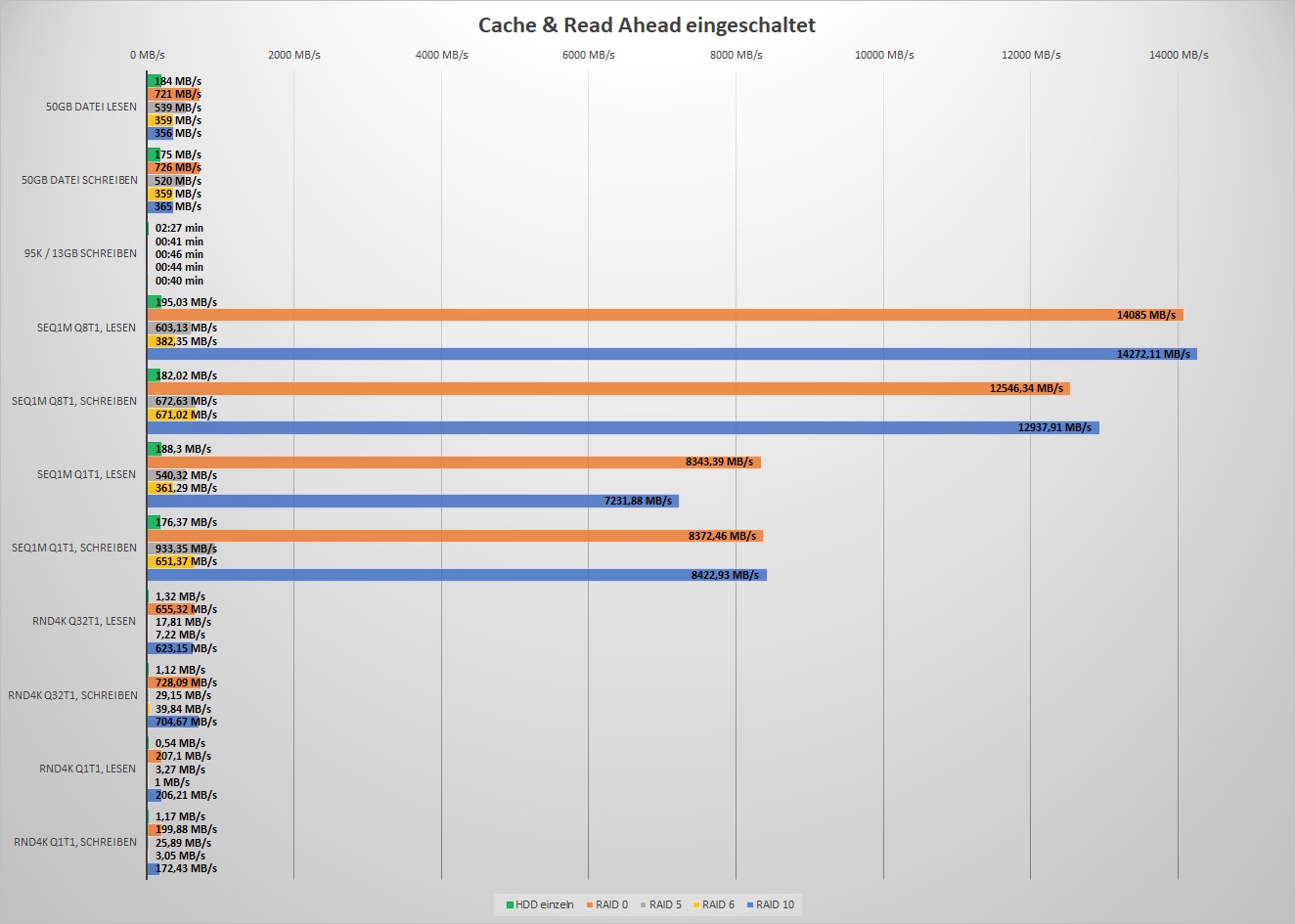 Daher einmal mit aktiven Cache & ReadAhead getestet und einmal mit deaktivierten Cache & ReadAhead soweit es möglich war (also einmal alles an Raidcontroller optimierungen ein, und einmal alles an optimierungen aus, auch HDD Cache)