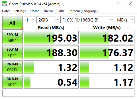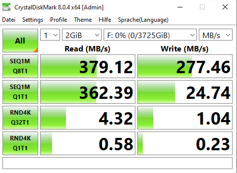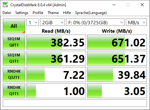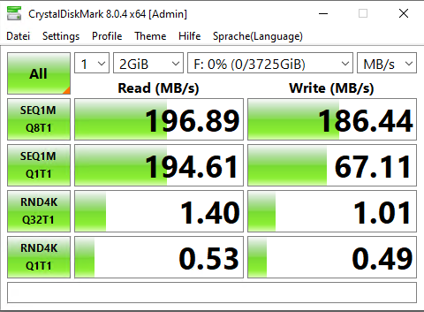 Ich habe jeweils zum testen einmal das Tool CrystalDiskMark genommen, aber um auch Real-Szenario workload zu haben auch mal einen Ordner mit knapp 96.000 Daten welcher ca. 13GB groß ist, und ein 50GB komprimiertes Image (also auch nichts mit gleichen blockinhalt oder dergleichen)