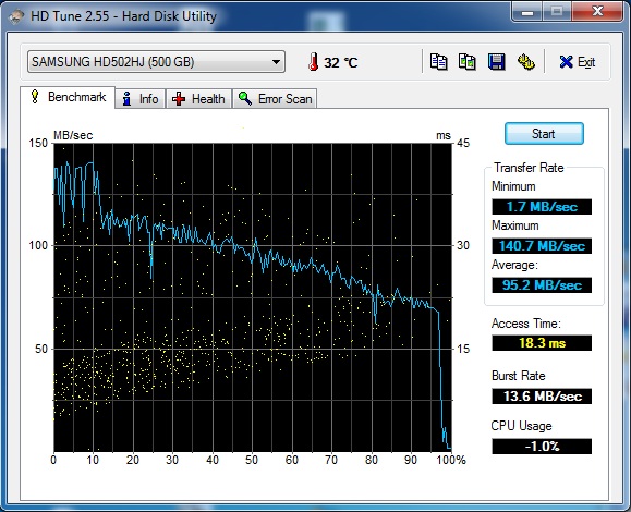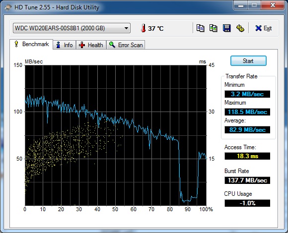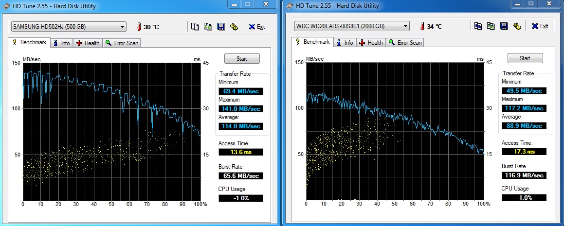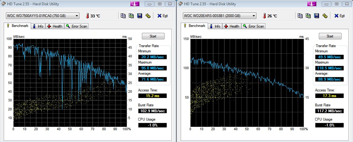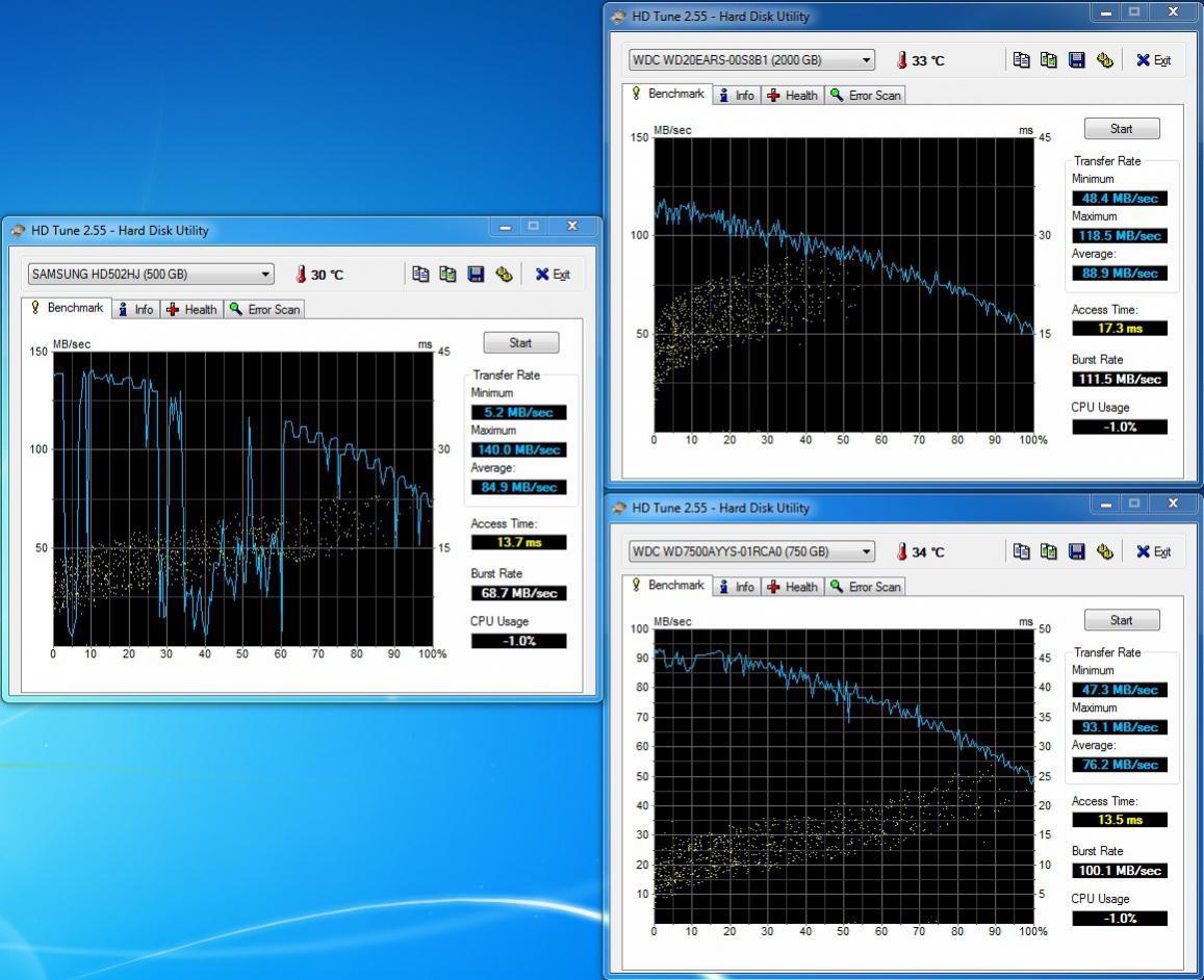 Wenn ich auf der Samsung-HDD HDTune benchen lasse und auf der WD-HDD im Explorer rumgucke / Dateien kopiere fällt die Lesegeschwindigkeit von >100MB/s sofort auf <10MB/s ab.