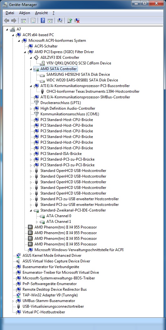 Beim Suchen im Internet habe ich des öfteren gelesen, dass das Problem durch Fehler mit den AHCI-Treibern hervorgerufen werden kann weshalb ich bereits versucht habe die Platten als IDE-Laufwerke anzusteuern, was leider nicht geholfen hat.
