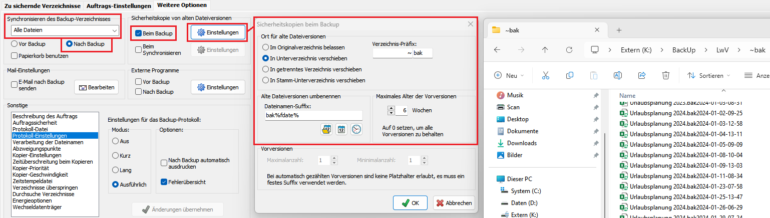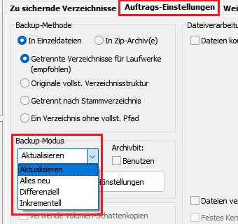 Backup-Modus: Aktualisieren nach "D:\Backup"