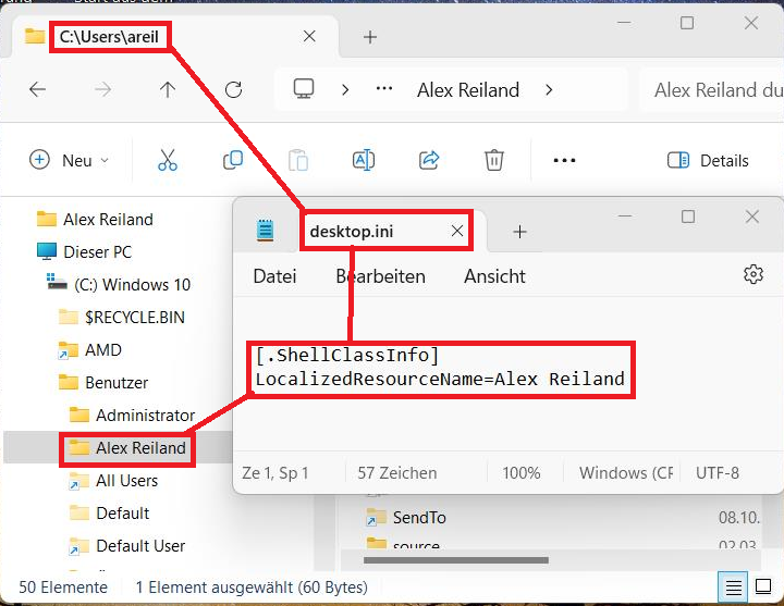 Wenn ich den Pfad der eigenen Dokumente nun in z.B. "C:\Users\Nutzername\Meine_Daten\" abändere so lauten die angezeigten Ordner trotzdem "Benutzer" und der Ordner "Meine_Daten" wird nur als "Dokumente" angezeigt, nicht so wie dieser eigentlich heißen sollte. Ist das Absicht? Warum bekomme ich den vollständigen, richtigen, Pfad nirgends angezeigt und warum wird mein Ordner "Meine_Daten" in "Dokumente" geändert. Den richtigen Pfad sehe ich nur wenn ich den vollständigen Pfad per rechter Maustaste in die Zwischenablage kopiere.