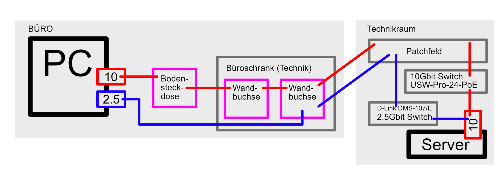Im Schema ist die rote Linie mein Wunsch, aber funktionieren tut nur die blaue Linie. Also direkt vom PC über die interne 2.5Gbit LAN-Buchse in die Dose, die wiederum direkt in den Technikraum geht. Leider funktioniert aber auch dort der Anschluss am 10Gbit des Switches nicht. Windows zeigt an das keine Verbindung besteht. Deshalb hab ich testweise mal ein 2.5Gbit Switch gekauft um den PC mit dem Server zu verbinden. Die Verbindung scheint stabil zu sein.