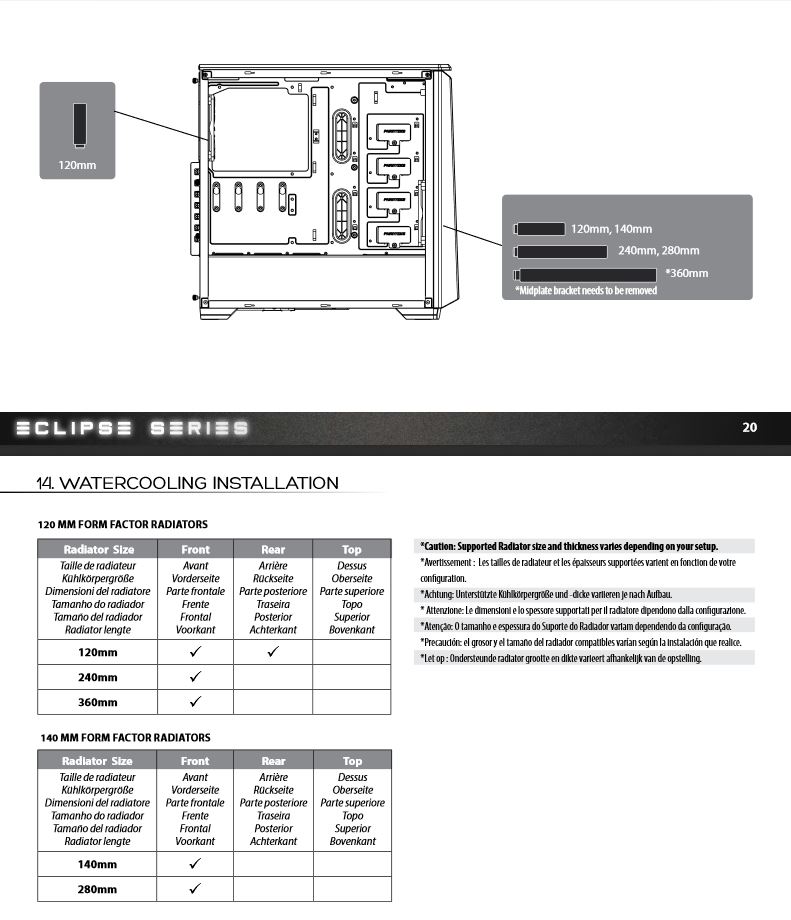 Vorne würde dann ein 360mm Radi zum Einsatz kommen, wie dick dieser sein darf, habe ich leider nirgends finden können. Hinten, wenn nicht anders möglich, würde ich meinen kleinen Alphacool NexXxoS ST30 120mm verbauen, um die Kühlfläche etwas zu vergrößern...