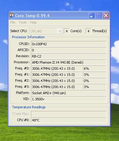 Im Idle unter Windows XP Pro zeigen mir Speedfan, Everest, HWMonitor und CoreTemp so ca 46 - 49 Grad an (direkt nach dem Hochfahren). Lüfter läuft mit ca. 960 RPM