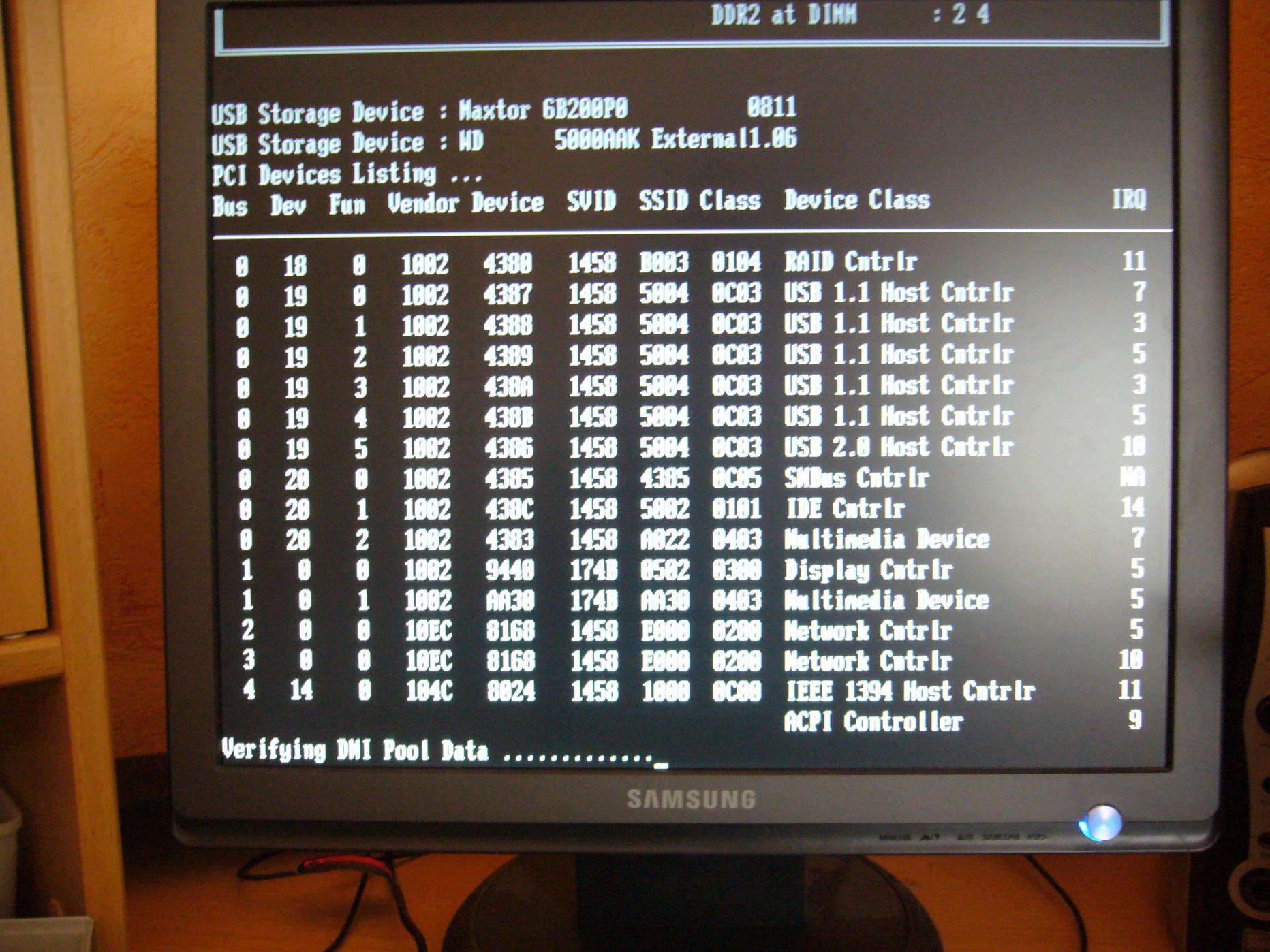 Tja. Nachdem ich das gemacht habe, passiert jetzt IMMER genau das, was vorher nur selten (und durch einen Druck auf Reset behoben) aufgetreten war. Der Rechner hängt. genau bei "Verifying DMI Pool Data"