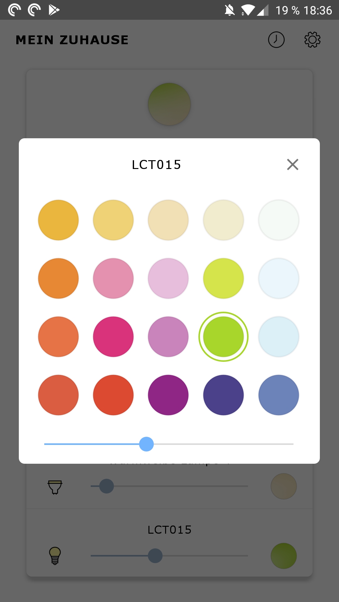 Im Anschluss kann man die Lampe über die App steuern, heller und dunkler machen, das Weißspektrum und die Farbe ändern. Bei der Farbe ist es allerdings nicht möglich diese stufenlos zu wählen, sondern man hat nur bestimmte Auswahlmöglichkeiten.