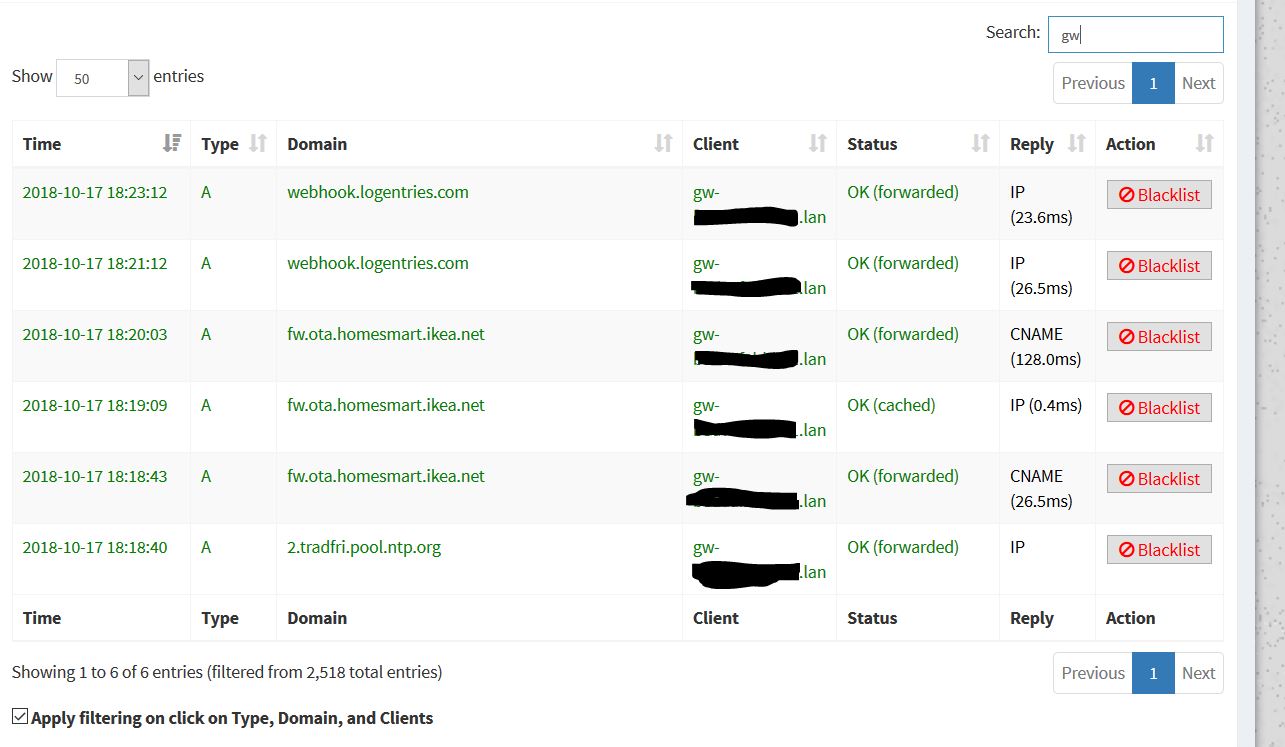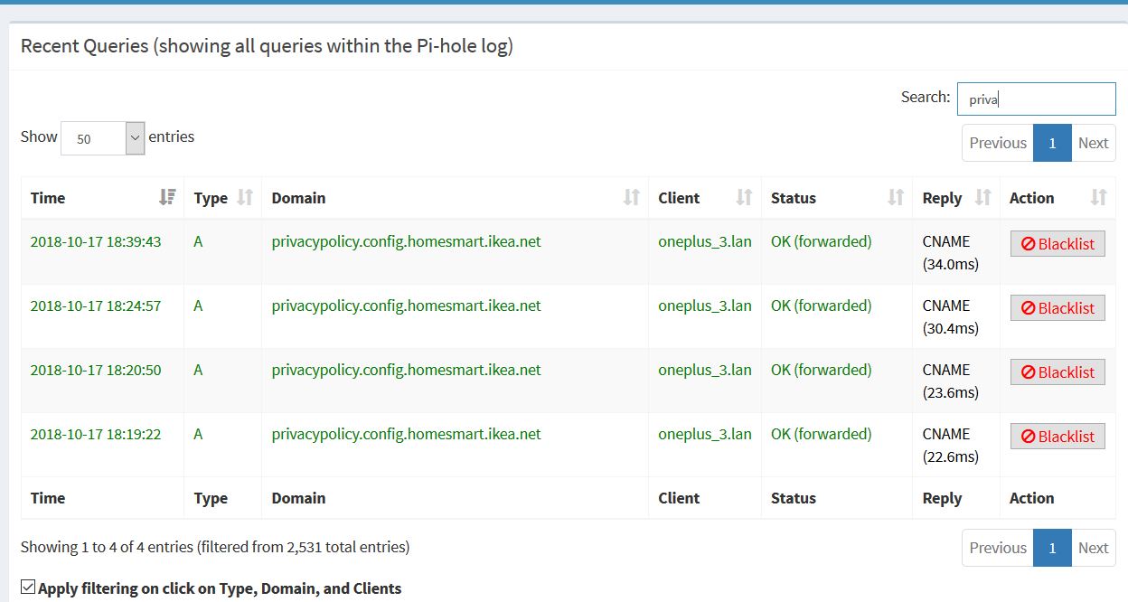 Als ich so am rumspielen und nebenbei mein Pihole offen war, kam mir die Idee die Netzwerkabfragen der beiden Gateways und der jeweiligen Android Apps zu überprüfen.