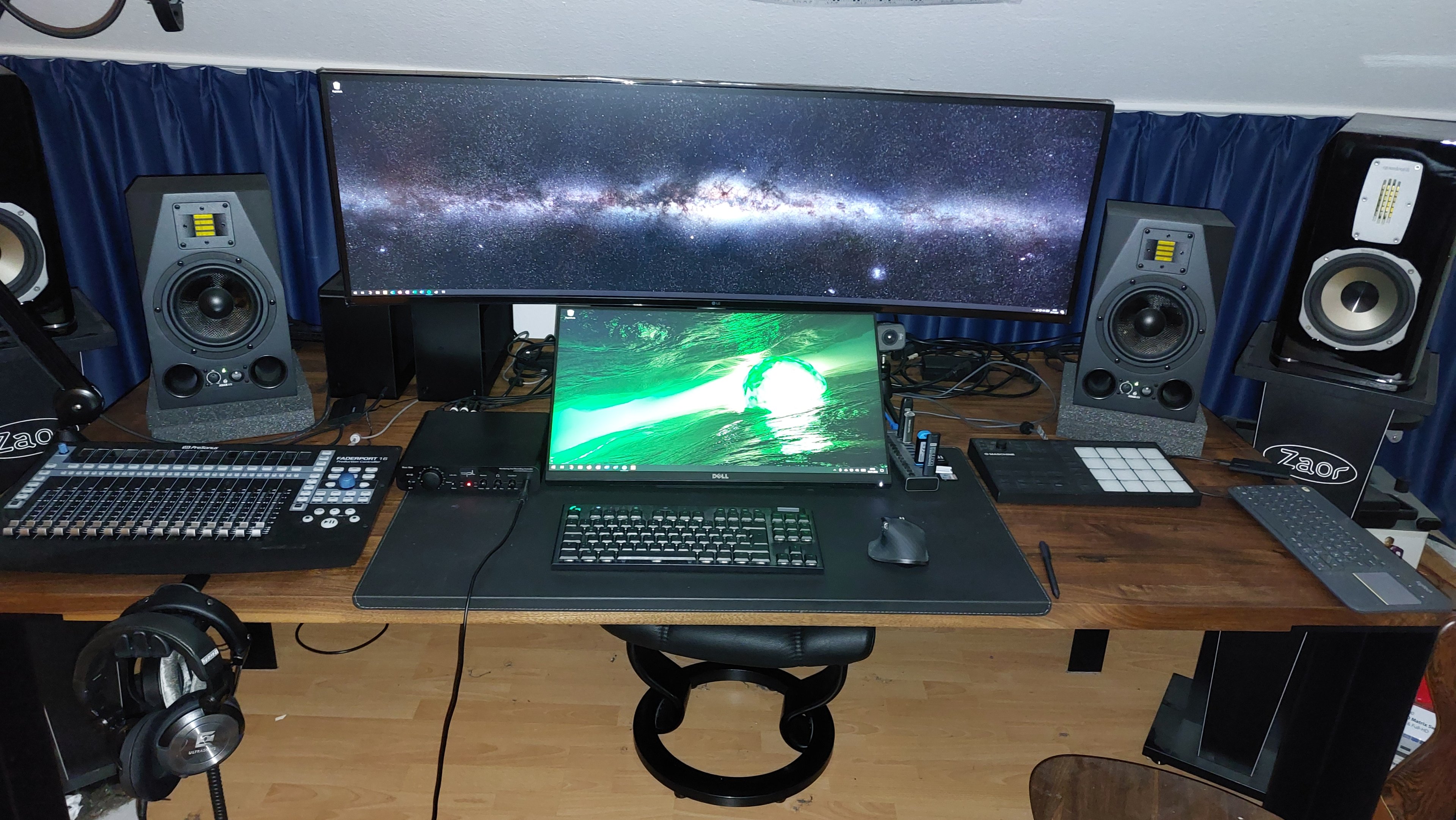 War da noch in Umbauphase, sodass noch kein Kabelmanagement vorhanden ist, sondern nur alles hinten auf dem Tisch gelegt, bis ich mit der Gesamtkonstellation zufrieden bin, und das bin ich zur Zeit auch. Nur habe ich aktuell noch nicht eingeplant, mein Laptop da mit einzubinden, was ich gelegentlich dort bräuchte. Dann kann ich auch die Kabel hübsch verlegen.