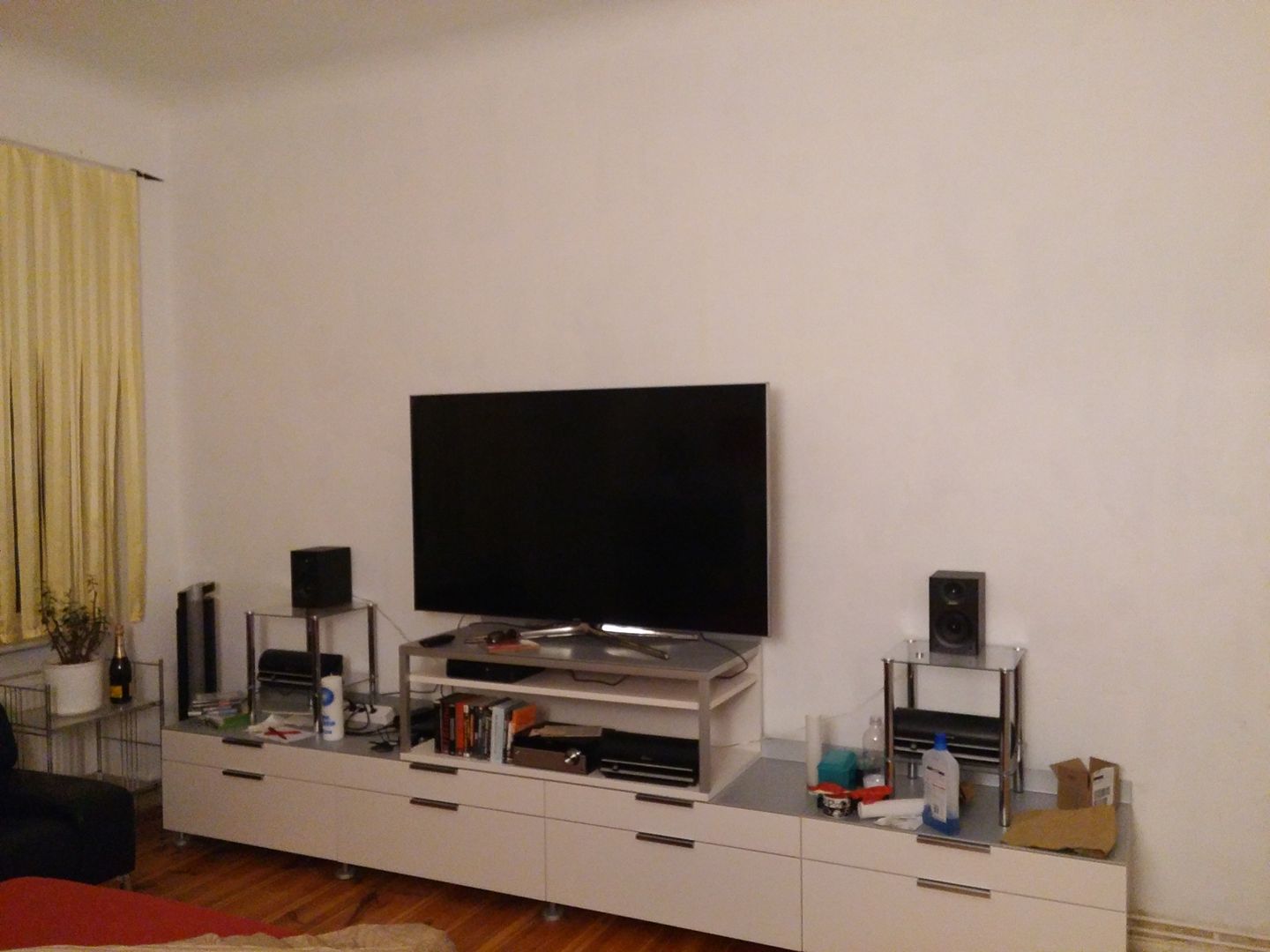 Anbei mal ein Bild von der Wand wo noch der alte 65 Zoll TV steht - ich möchte dann vom Bett aus schauen,würde dann genau 350cm von der Wand weg sitzen.