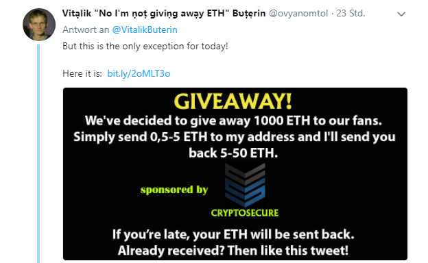 es ist ja nicht nur Buterins account davon betroffen. in so gut wie jedem coinbezogenen twitterchannel werden durch fake-accounts jegliche coins auf die weise erbeutet. eigentlich unfassbar, dass das in diesem ausmaß funktioniert.