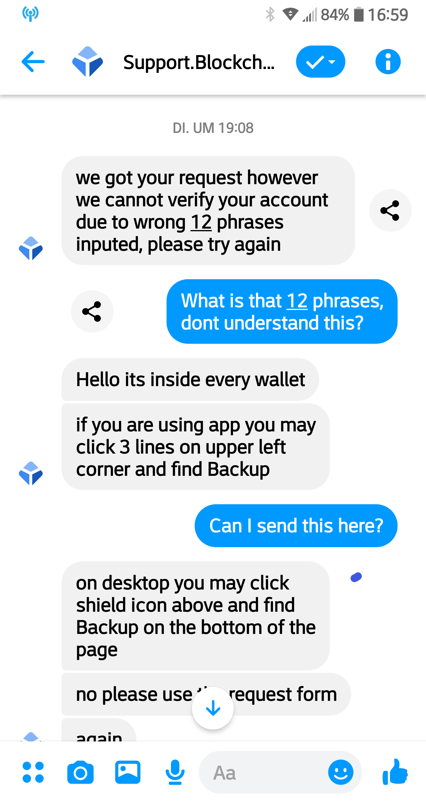 Ich hatte eine Frage an Blockchain und hab mich über den Messenger an die gewandt. Die wollten zur eindeutigen Identifizierung diese 16 Wort Pass und da wars passiert... Nie wieder dieser Anbieter. Bin jetzt bei einem anderen der viel schneller und einfacher funktioniert...