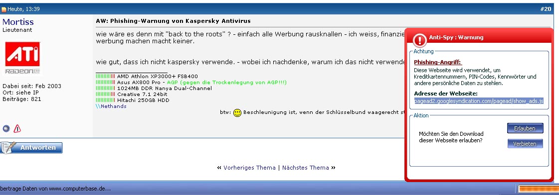 Zahlreiche Leser machen uns darauf aufmerksam, dass beim Surfen auf ComputerBase das Anti-Phishing-Modul des Virenscanners Kaspersky Antivirus eine Warnung ausgibt, dass diese Website verwendet wird, um „Kreditkartennummern, PIN-Codes, Kennwörter und andere persönliche Daten zu stehlen“. Dabei handelt es sich um falschen Alarm.