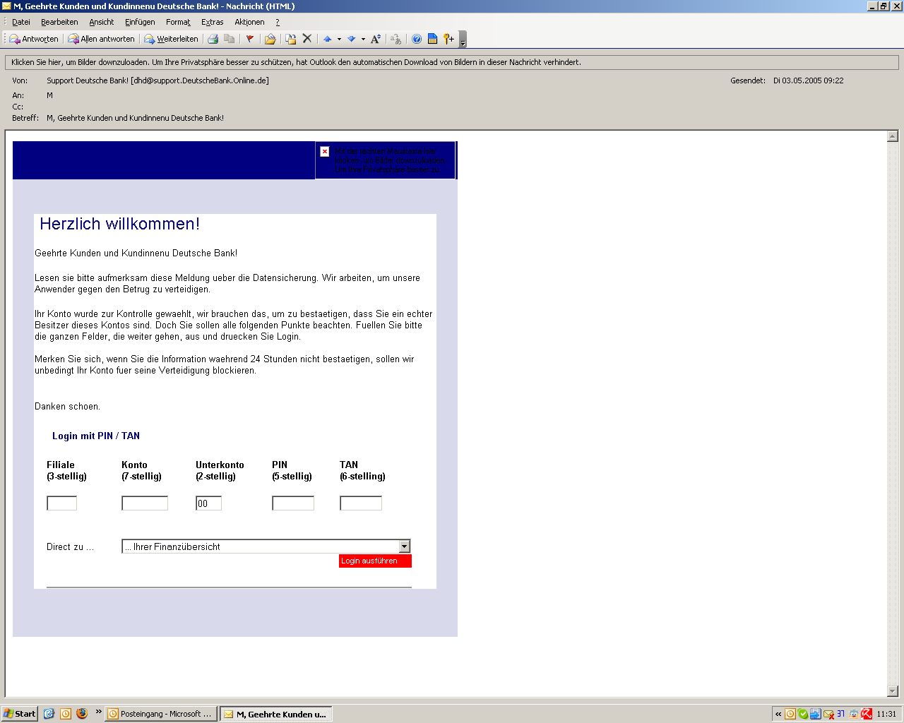 Hab heut auch diese Mails bekommen, einmal von der Postbank und einmal von der Deutschen Bank . Tja was soll ich da sagen, isch abe gar kein Konto eh, bei Postbank und Deutsche Bank.