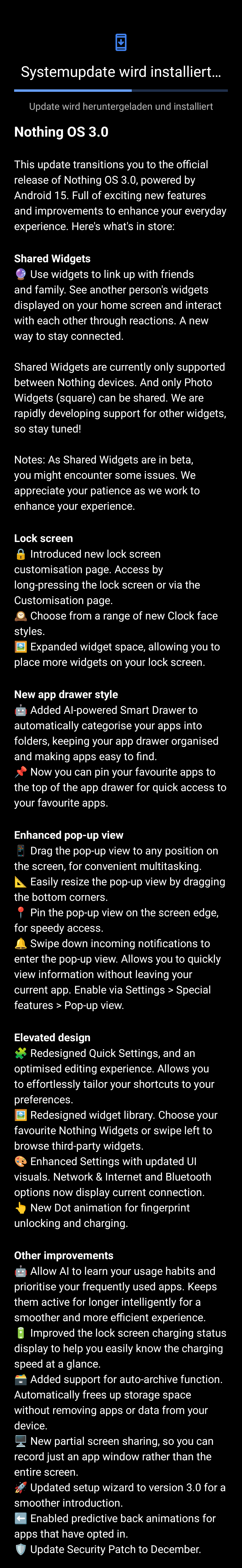 Da freue ich mich ja, dass mein Nothing Phone 1 noch mit Android 15 versorgt wird. Bin wirklich sehr zufrieden mit dem Handy. OS läuft flüssig und von der Verarbeitung muss es sich nicht hinter Premiumhandys verstecken.