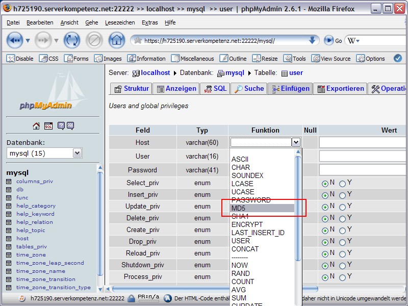 wo kann ich das den mit md5 einstellen bei phpmyadmin???