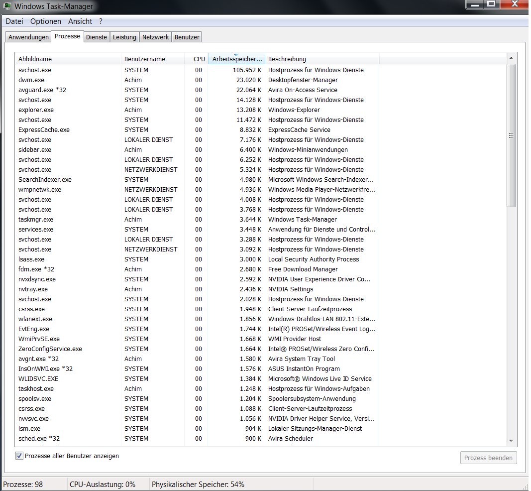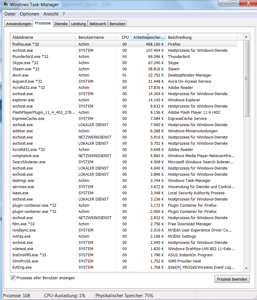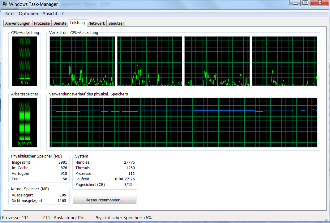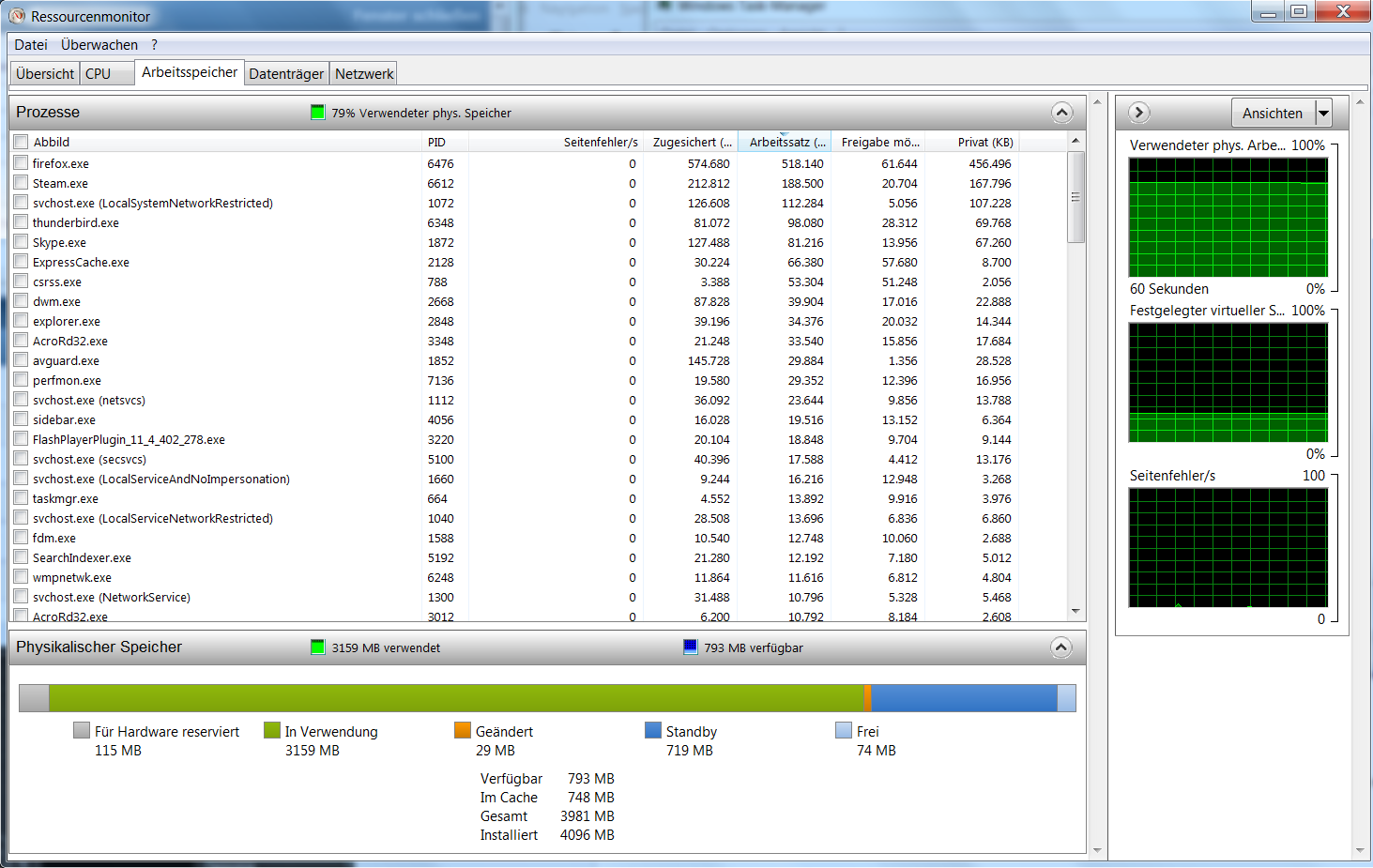 Von den 4 GB sind jetzt angeblich 2,95GB belegt. Da ich bei Firefox immer all meine Tabs speichere, belegt mir das allein um die 500MB, aber dennoch komme ich insgesamt, wenn ich alle Prozesse mal so grob zusammenzähle, auf maximal 1,1GB Arbeitsspeicherbelegung. Den Rest kann ich mir aktuell nicht erklären.