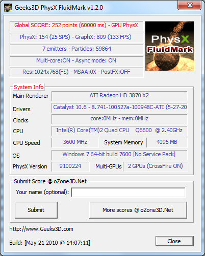 @HisN: Ach so meinst du das. Einstellung wäre Standart also 1024x768 , Multicore Physx, Asyncmode off und 7 emitters.