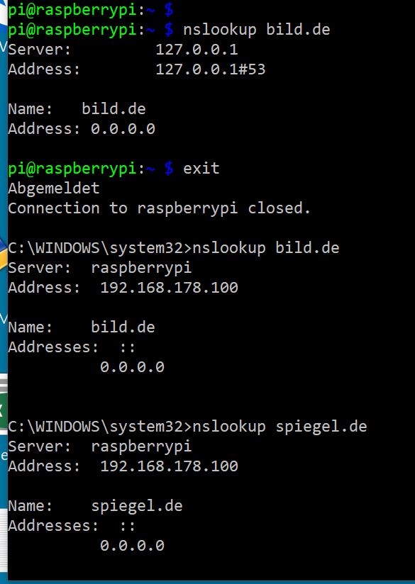 Ich habe den Raspi auch versuchsweise mit einer zweiten SD-Card komplett neu aufgesetzt und lasse ihn damit nur in meinem Mini-Funkrouter-Netz arbeiten (ohne PC oder sonstige Clients). Raspi ist hier also "allein zu Haus". Auch hier ignoriert er meine Blacklist-Einträge bild.e und spiegel.de. Werbung wird aber etwas besser blockiert.