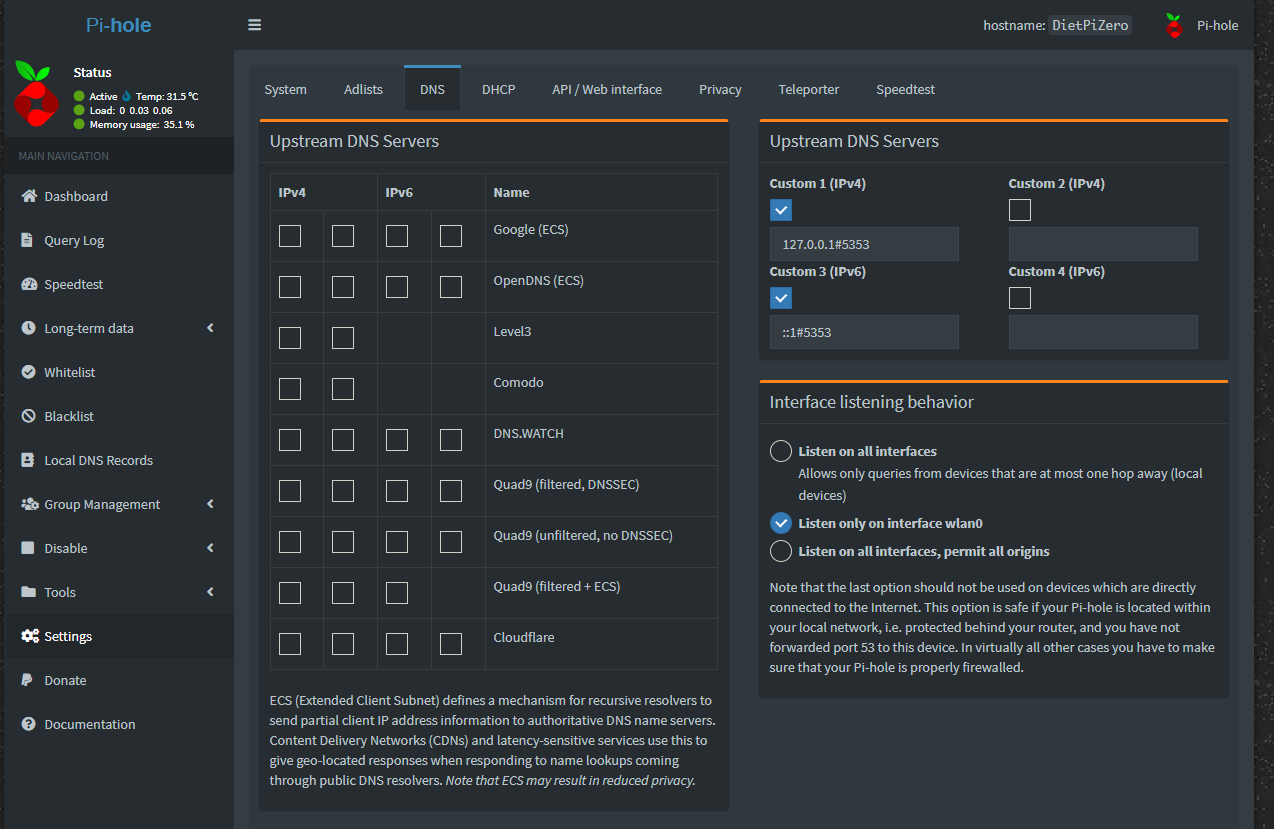Hier ein Screenshot zu den erforderlichen Einstellungen im Pihole (der Port entspricht dem, den Du in der pihole.conf eingerichtet hast):