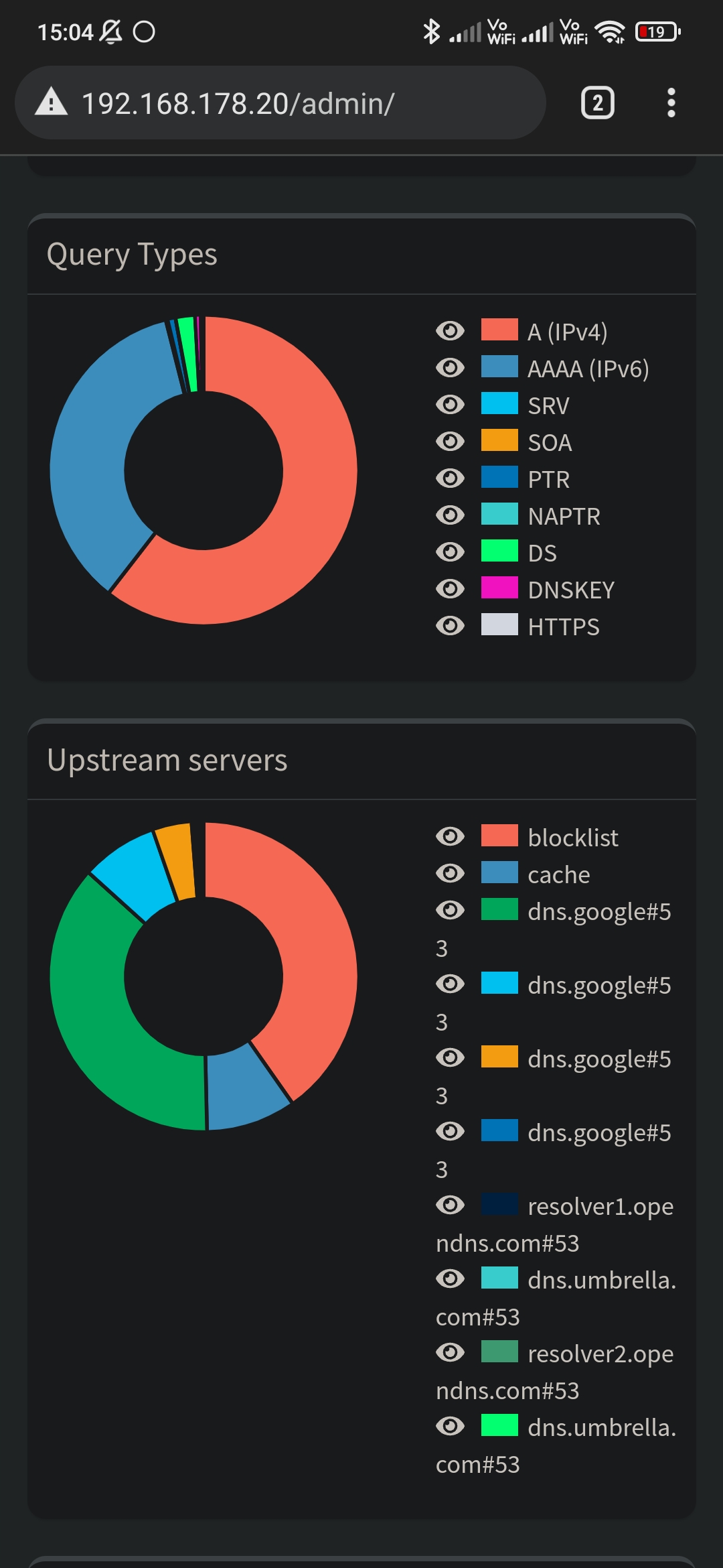 Ein paar Tage später verlor der Fernseher beim Streaming die Verbindung. Und tatsächlich hatten die anderen Geräte wieder die o.g. Probleme. Das wiederholte sich ein paar Mal. Stets hatten alle Geräte aber weiter ihre IP-Adressen, inkl. der Pihole Adresse für die Alternativen DNS. DSL-Verbindung war absolut o.k. und fehlerfrei. Keine Disconnects oder andere Störungen protokolliert.
