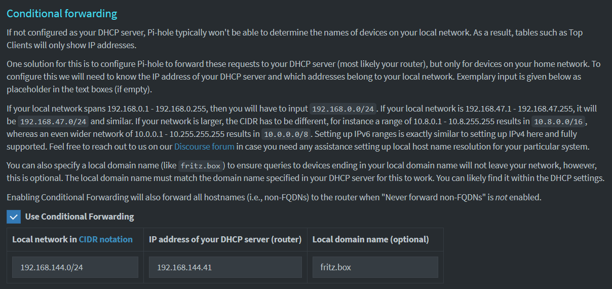 Ich habe an beide Varianten in der Fritzbox ausprobiert (nicht gleichzeitig) und die IP der Synology eingetragen. Im Pihole habe ich noch zusätzlich das Conditional Forwarding aktiviert. Die Namensauflösung funktioniert nicht, sodass ich nicht mehr ins Internet komme.