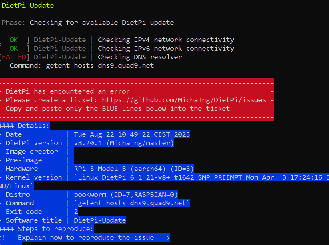 Das kannst Du ganz leicht selbst herausfinden. Stelle bitte im Menü der Fritzbox die DNS-Einstellungen auf default, also vom Provider bezogen, bestätige mit OK und starte einen neuen Versuch, DietPi einzurichten. Wenn der auch mit derselben Fehlermeldung fehlschlägt, machst Du das, was in den roten Zeilen der Fehlermeldung steht. Also Du kopierst bitte den Inhalt der blauen Zeilen in die Zwischenablage (bei Putty wird das markiert und es befindet sich bereits in der Zwischenablage, also bitte NICHT wie gewohnt Strg+c Drücken), und schickst die Meldung an die in den roten Zeilen angegebene Adresse bei github. Alternativ kannst Du dich im DietPi-Forum anmelden, was ohnehin ratsam wäre, denn Probleme können immer mal wieder auftauchen) und Deine Fehlermeldung dortrein posten. Möglichst auf englisch, bei der Übersetzung kann DeepL helfen), aber auch wenn Du auf deutsch Dein neues Topic verfasst, wird Dir geholfen werden.