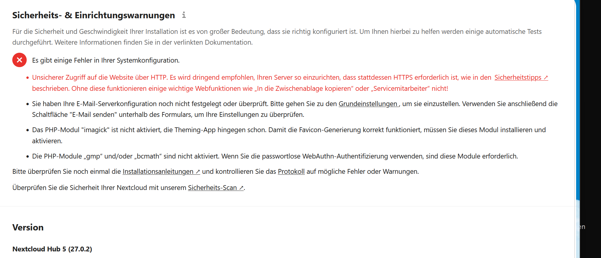 So, also weiter im Programm :-) Unter "Sicherheits- und Einrichtungswarnungen" erhalte ich folgende Fehlermeldungen (siehe Screenshot). Die Warnung mit der Telefonregion konnte ich bereits lösen, ebenso das Problem mit den PHP-Modulen gmp und/oder bcmath.