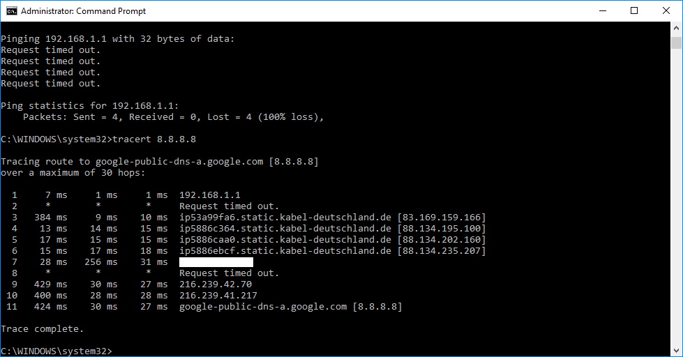 Sicher, dass der Router die 192.168.1.1 hat? Es ist recht unüblich, dass ein Gerät im eigenen Subnetz nicht auf einen Ping antwortet. "ipconfig /all" zeigt dir deine IP und die des Routers. Da sollte eigentlich auch ein Ping möglich sein. Ansonsten machst du mal ein "tracert 8.8.8.8". Da siehst du die einzelnen Stationen, die der Ping bis zum Ziel durchläuft. Ergebnis hier posten.