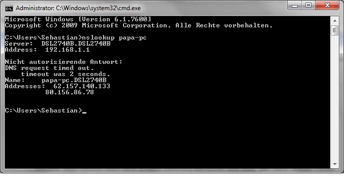 nslookup liefert mit 2 antworten, einmal autorisierte vom Router der die IP des PCs im Lan korrekt auflöst und einmal eine nichtautorisierte Antwort die 2 öffentliche Adressen enthält.