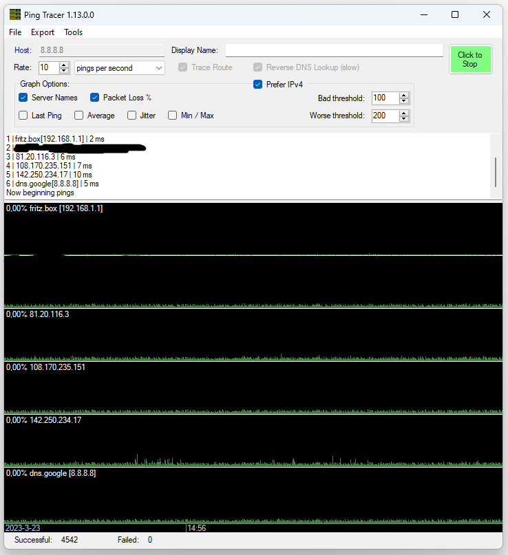 Hab seit ca. 1 Monat sporadische Anstiege in der Ping beim Spielen. Um herauszufinden, ob es nicht an meiner Hardware liegt, habe ich WinMTR installiert und parallel zum Spiel für paar Minuten (+/- 10 min) laufen gelassen. Hier ist das Resultat von WinMTR: