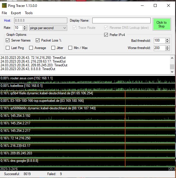 Rate war bei 10 pings per second und 8.8.8.8 als Host