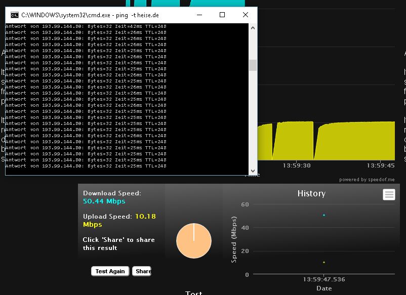 Edit: Screenshot mit ausgelastetem Upload und in die 20 - 30 ms Ping währenddessen. Die 42 ms oben in der cmd sind seltsamerweise noch vom Download.