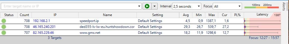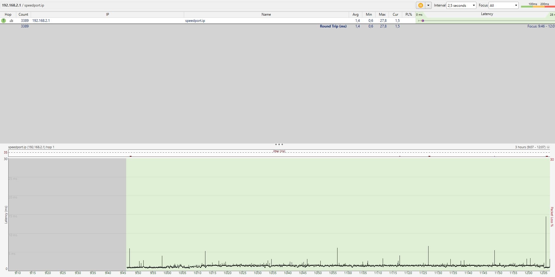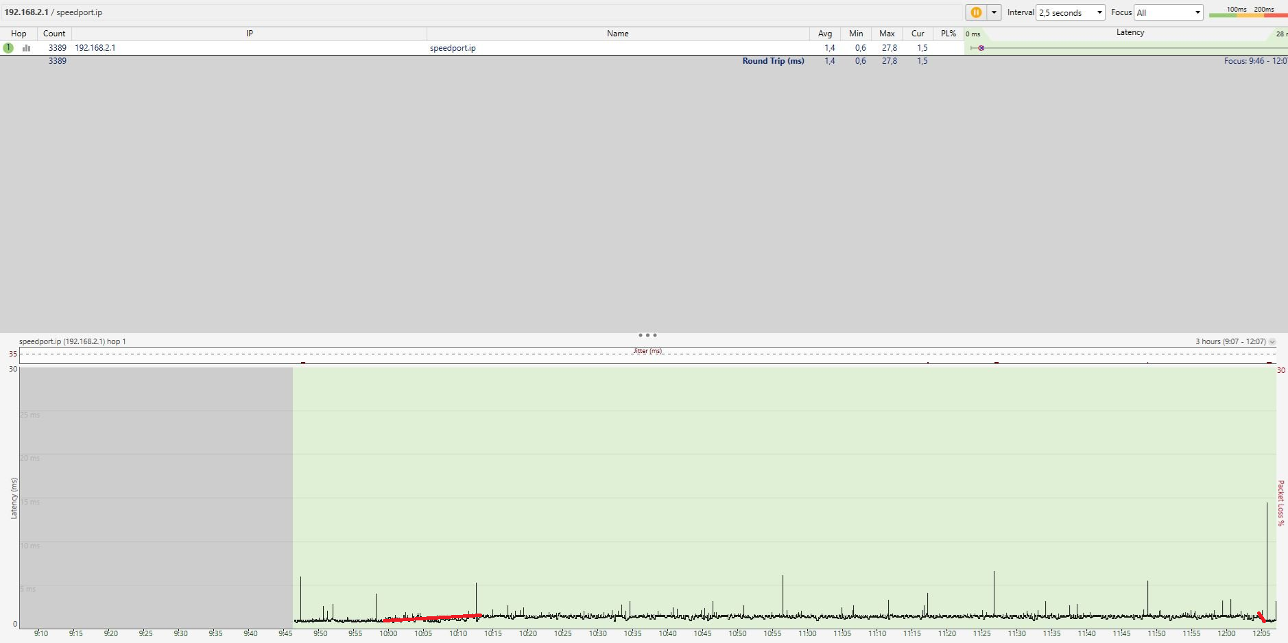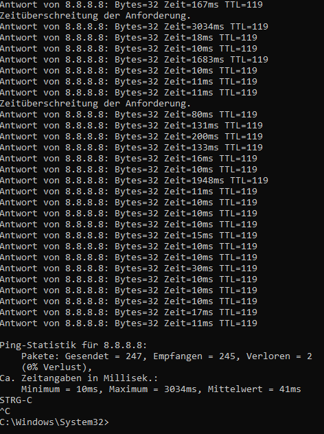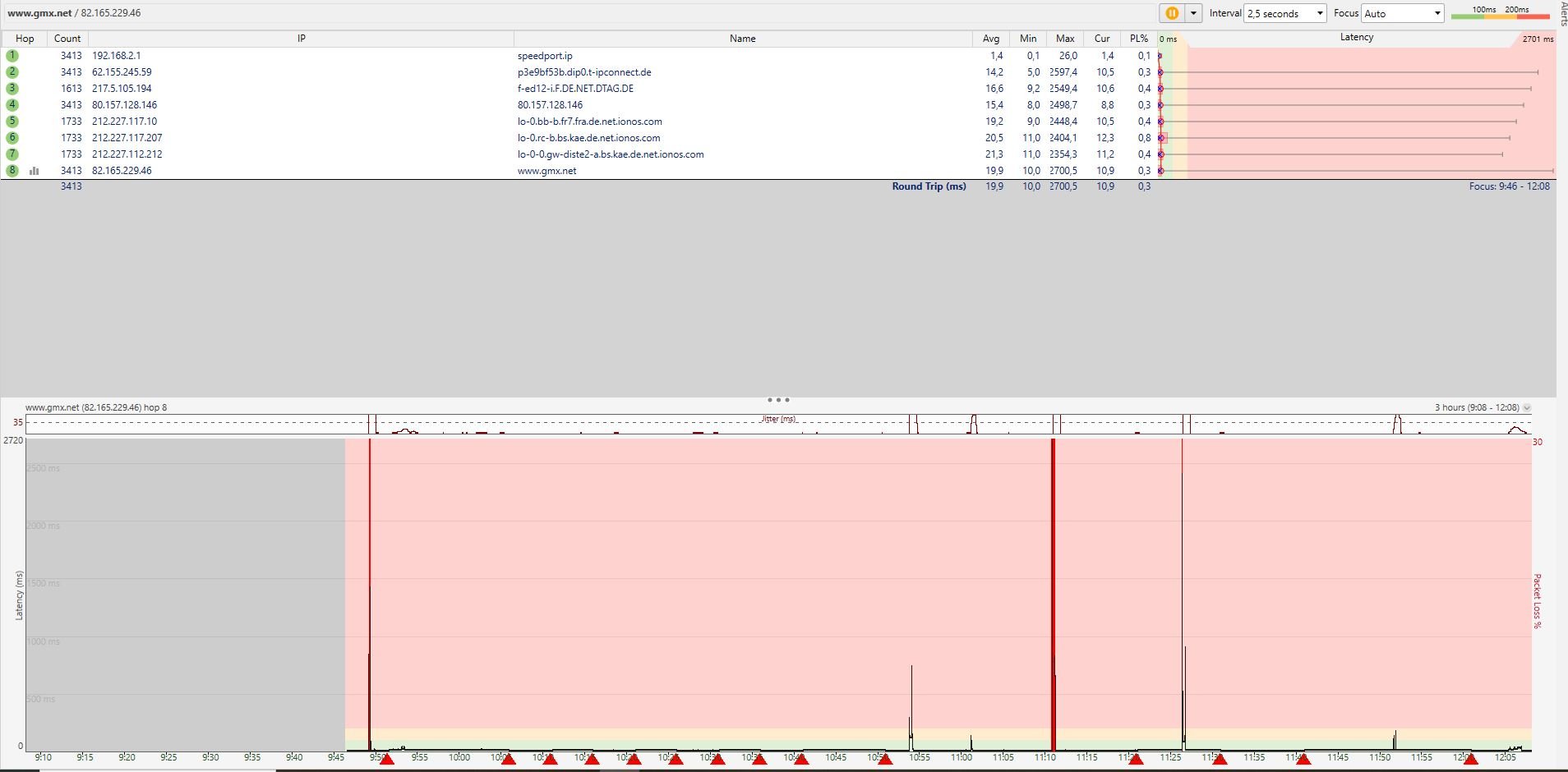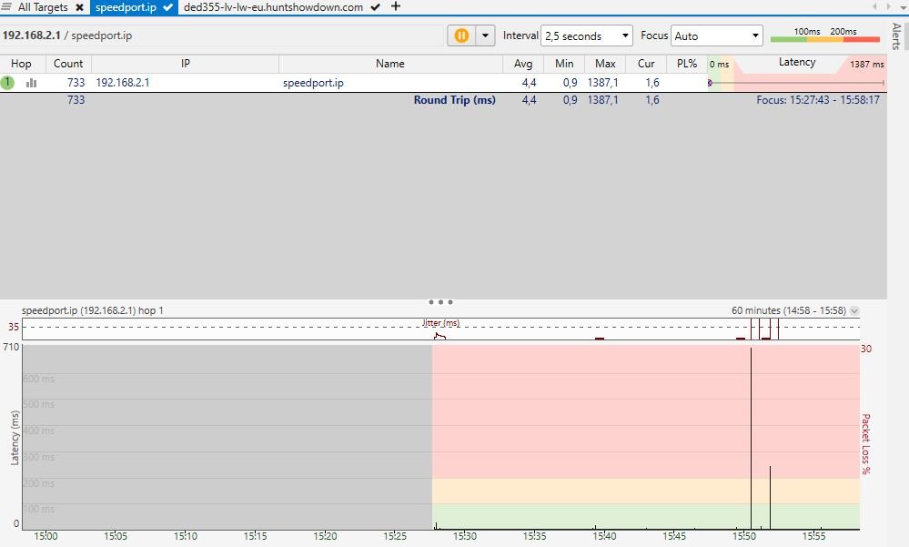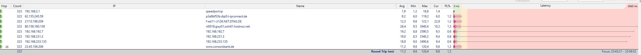 Kann es so gewesen sein? Wenn ja, dann jagen wir ein Problem in deinem Rechner. Ein Verdacht, den ich schon lange habe, dass die Endgeräte eine Rolle spielen. Bei WLAN (Handys etc) kann WLAN die Ursache sein, bei LAN die Software der Endgeräte. Das hat ähnliche Symptome, aber zwei unterschiedliche Ursachen. Übrigens: Die anderen mittelgroßen Ausreißer sind alle ziemlich genau im gleichen zeitlichen Abstand. Noch ein Hinweis auf die Software der Endgeräte, irgendeine zyklische Aufgabe.