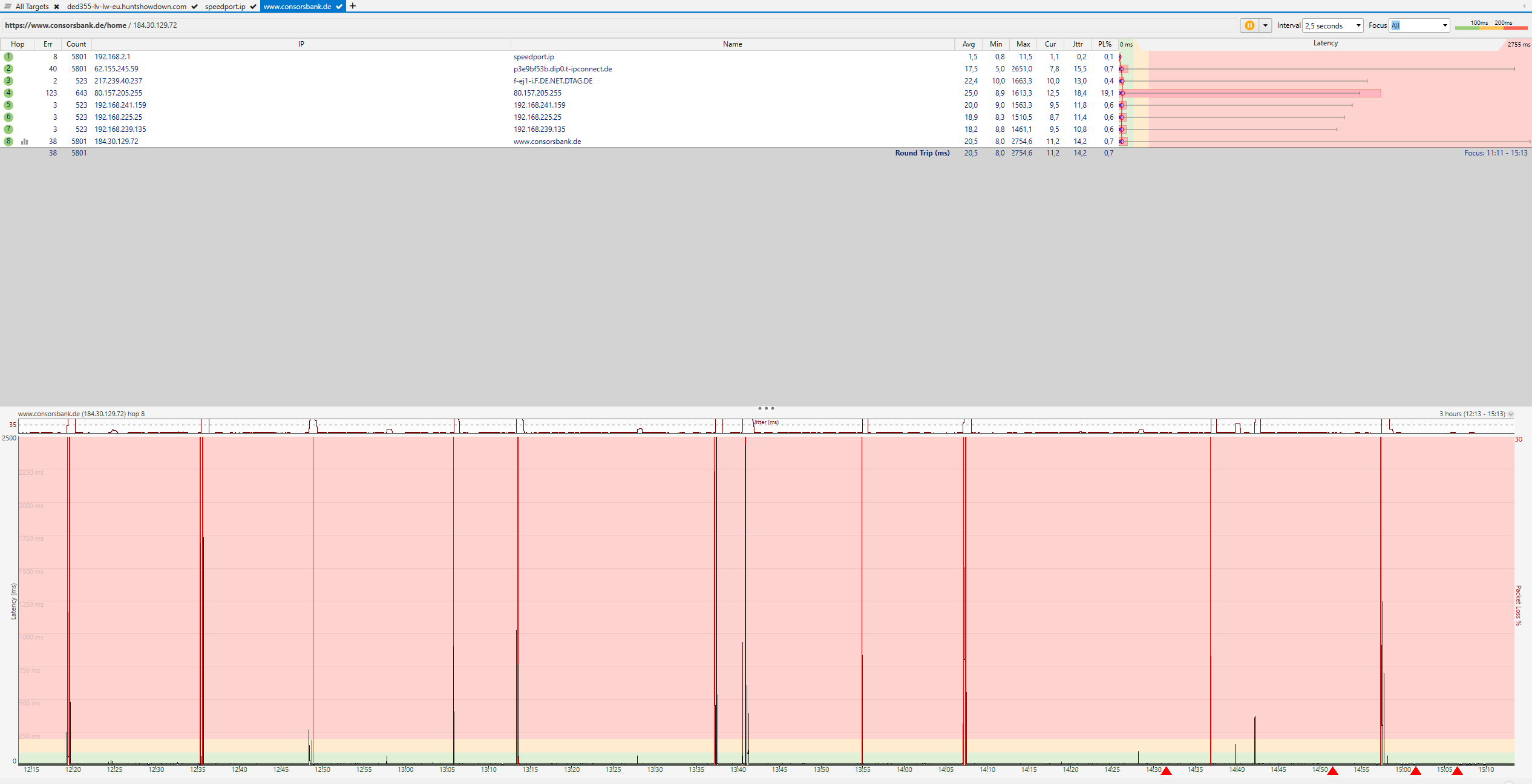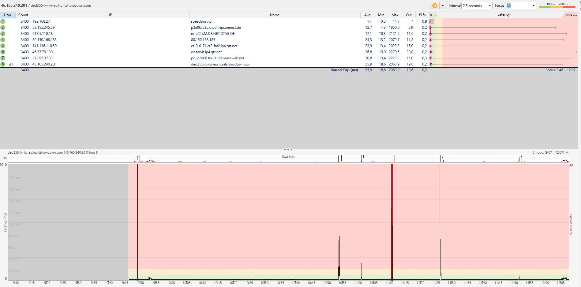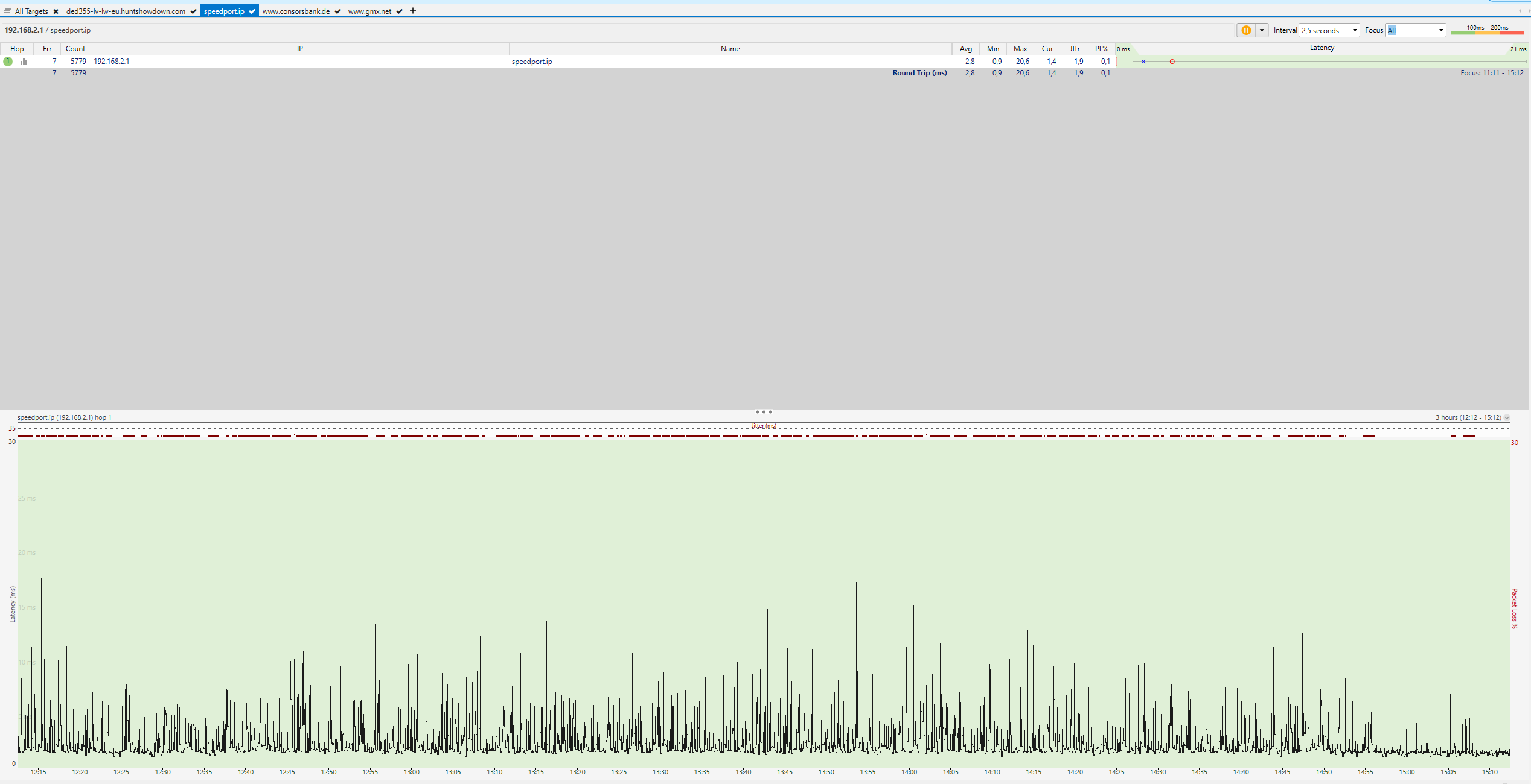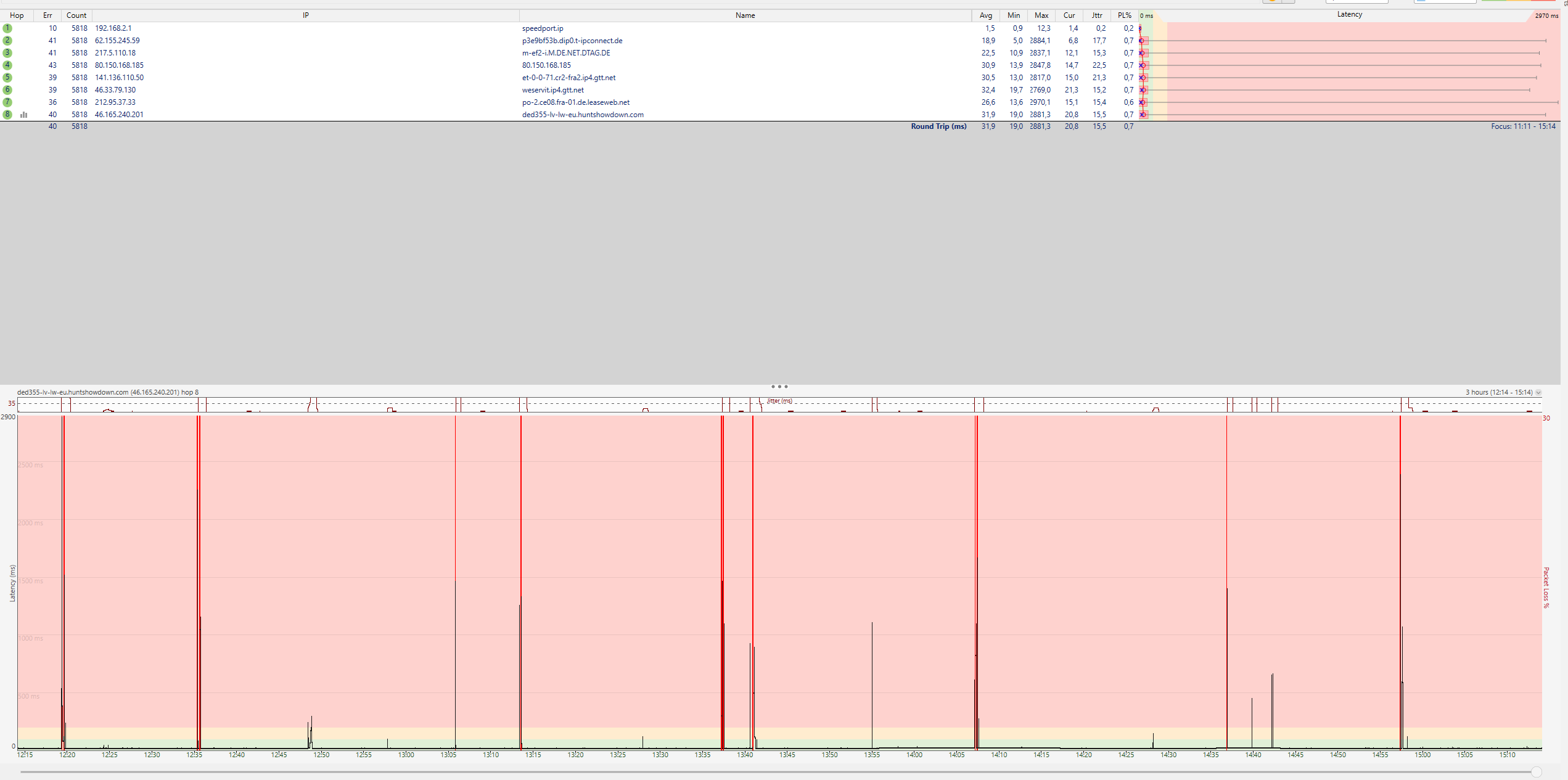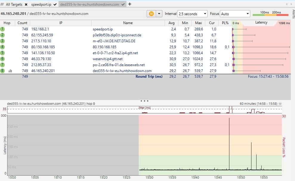 Kann es so gewesen sein? Wenn ja, dann jagen wir ein Problem in deinem Rechner. Ein Verdacht, den ich schon lange habe, dass die Endgeräte eine Rolle spielen. Bei WLAN (Handys etc) kann WLAN die Ursache sein, bei LAN die Software der Endgeräte. Das hat ähnliche Symptome, aber zwei unterschiedliche Ursachen. Übrigens: Die anderen mittelgroßen Ausreißer sind alle ziemlich genau im gleichen zeitlichen Abstand. Noch ein Hinweis auf die Software der Endgeräte, irgendeine zyklische Aufgabe.