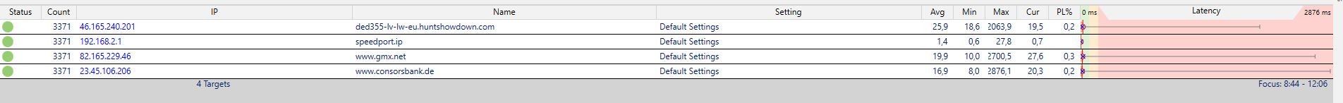 Wenn ich mir jetzt was konstruiere: Du hast deinen Rechner am Router angesteckt, alles eingerichtet und dann bist du gegangen uns hast das Ganze für gut 2 Stunden laufen lassen. Irgendwann hat der bemerkt, da ist niemand mehr. Es kamen Bildschirmschoner und Energiesparmechanismen, die CPU taktet runter, und das hat den Ping verzögert. Ganz am Ende kamst du wieder, hast die Maus bewegt, und das System wacht wieder auf, der Ping geht wieder runter. Aber dann hast du angefangen, dir die Ergebnisse anzusehen, hast Fenster verschoben etc., das System hatte viel zu tun. Und zack: Der Ausreißer kurz nach dem Aufwachen.