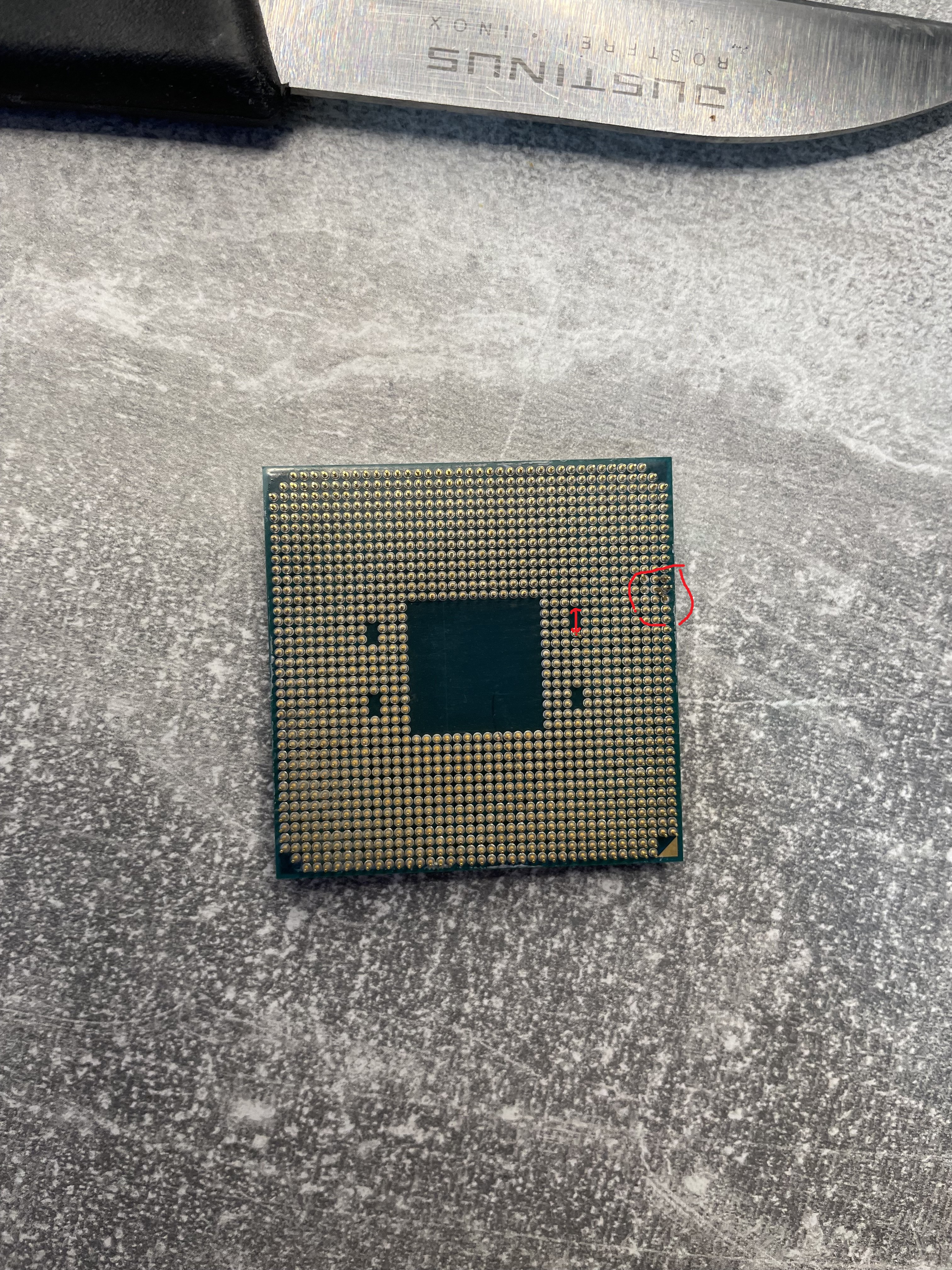 Dann: CPU hochhalten, gerade mit dem Auge hindurchschauen, die CPU dabei immer in 90°-Schritten drehen... wenn es "einigermaßen gerade" aussieht, dann reicht es, dass die CPU wieder in den Sockel passt. Auch, wenn es nicht direkt in den Sockel "flutscht", schaue einfach, mit wie viel Kraftaufwand (also mit seeeehr wenig) du die CPU in den Sockel bekommst - eben sehr kontrolliert.