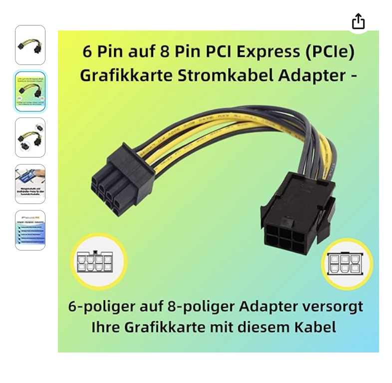 Ich weiß ehrlicherweise nicht, was für Kabel bei meinem Noname-Netzteil herumschwirren. Aber mal angenommen, ich hätte keine 2x 8pin zur Verfügung, gäbe es dann passende Adapter? Und falls es diese gäbe, könnte mir netterweise jemand einen passenden verlinken? Gerne Amazon, aber im Zweifel natürlich auch woanders.
