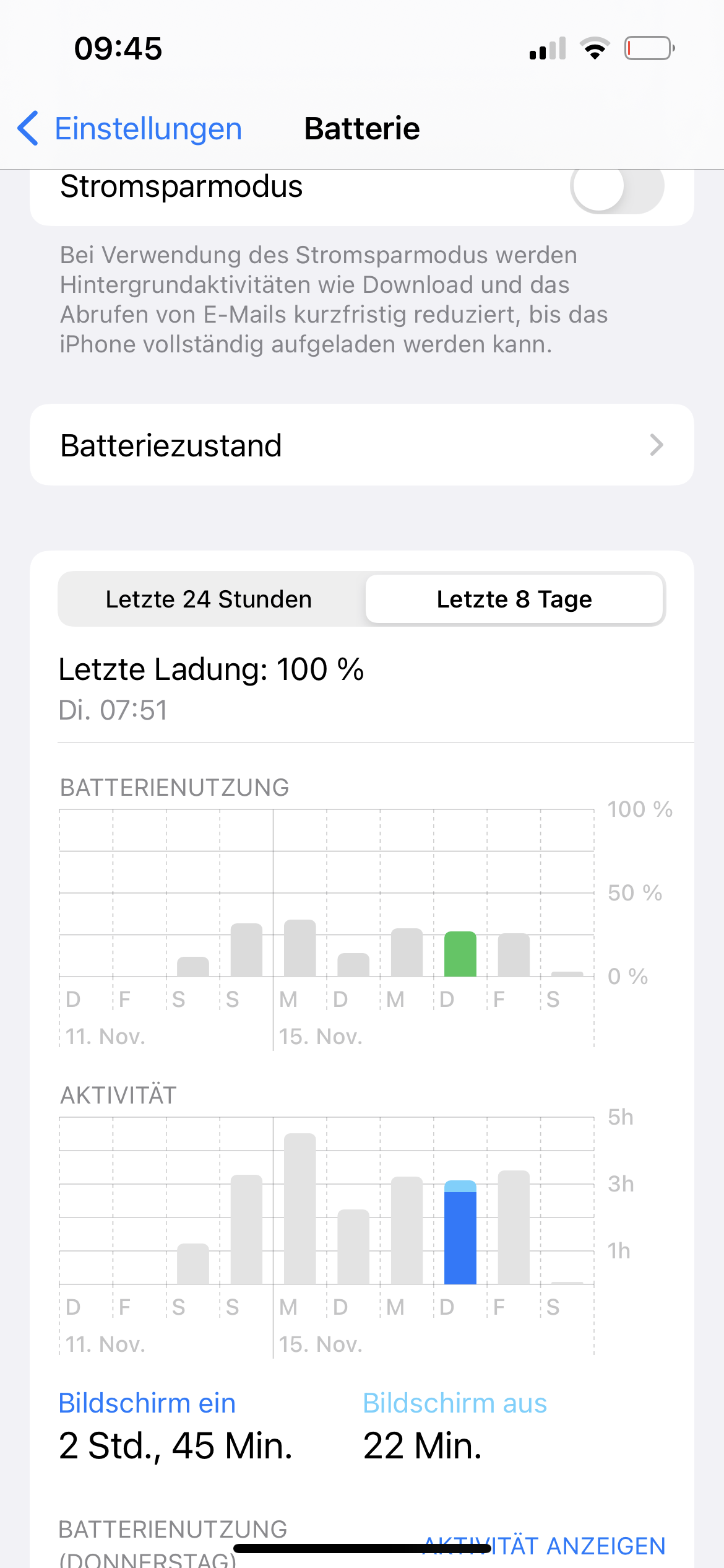 Ich habe das iPhone13 seit Dienstag Morgen nicht mehr am Strom gehabt. Ich bin bei mittlerweile 9.45h SoT und habe gerade noch immer 27% Akku und das bei bescheidenem Netz Empfang.
