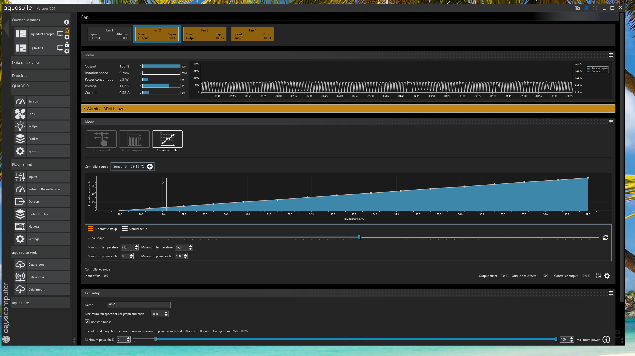 Man kann die Lüfterkanäle der AC PWM Steuerungen in drei Modi betreiben. Leistungsvorgabe (Power preset), Temperatursollwert (Target temperature) oder Kurvenregler (Curve controller). Du hast mit Curve controller aus meiner Sicht dem kompliziertesten Modus gewählt. Da sollte man schon wissen, was man tut. und das PWM Verhalten der eingesetzten Lüfter kennen, damit man Startwert, Hysterese, etc. passend einstellen und später optimieren kann.