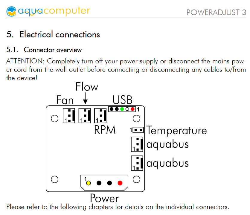 - Einen Typ PWM Lüfter mit Kanal 1 verbinden. Den Kanal auf Power preset stellen und mit Hilfe des Reglers testen, ob sich die Lüfter steuern lassen.