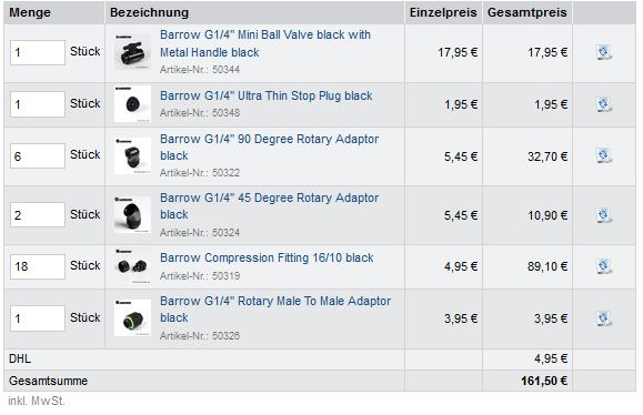 Ich hab mir vor 1-2 Monaten für 40 oder 45 Euro ein Set mit bestimmt 50 Fittingen, Winkeln Tempsensoren ect ersteigert, Neupreis 250+.
