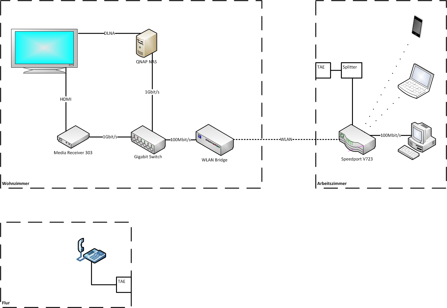 Arbeitszimmer: TAE-Dose + Splitter + Router (Speedport V723) + PC (über LAN), Laptop (WLAN)